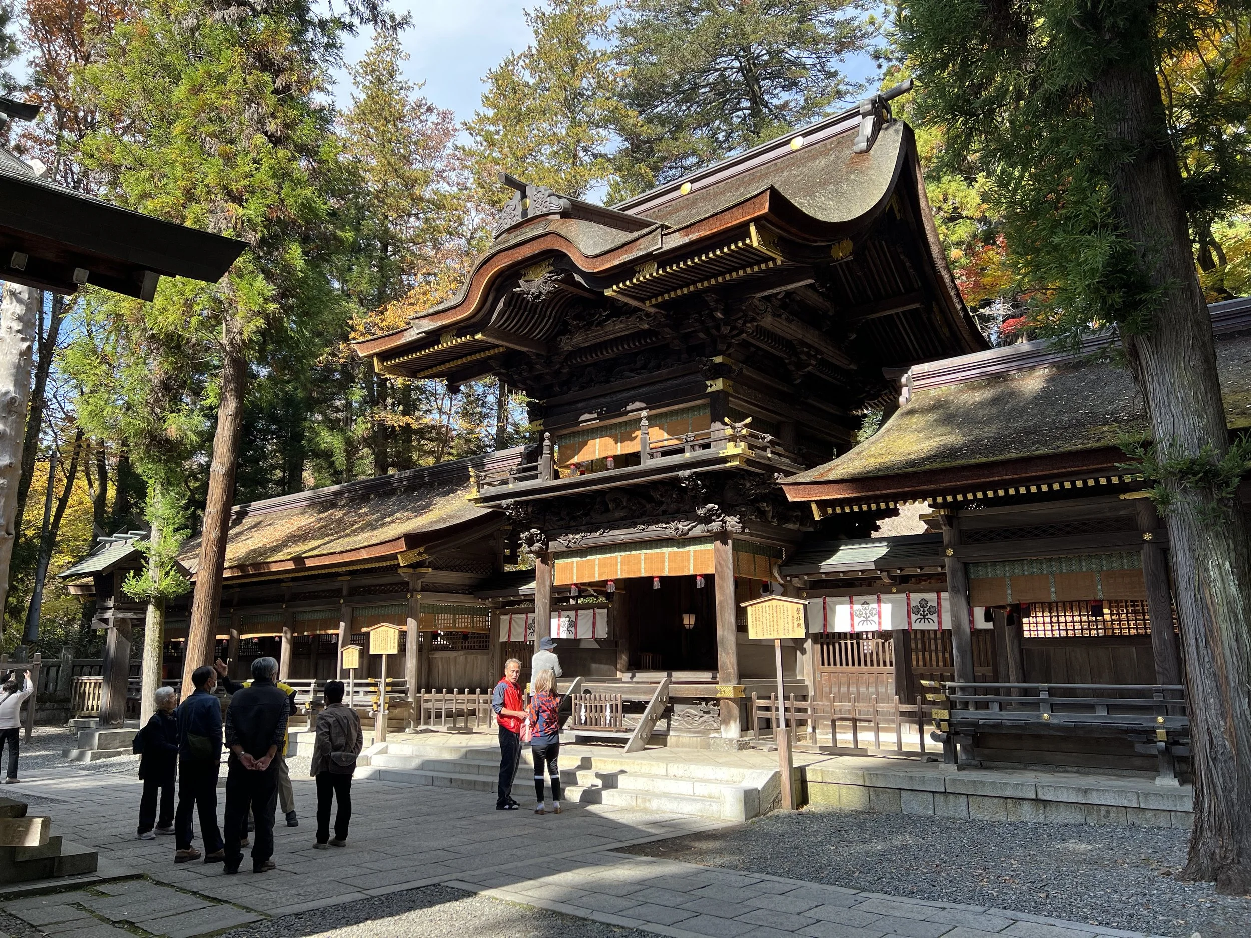 Shimosha Akimiya dates back to at least the late 7th century and is dedicated to the autumn deity Yasakatome-no-kami. One of the most unique things about this shrine is that it doesn’t have a traditional main hall. Instead, the object of worship is an ancient yew tree—serving as the shintai, or physical embodiment of the deity. The current shrine structures, completed in 1781 under the direction of Tatekawa Washiro, are beautifully detailed. Intricate carvings, aged wood, and the surrounding forest all come together to create a space that feels deeply rooted in time.