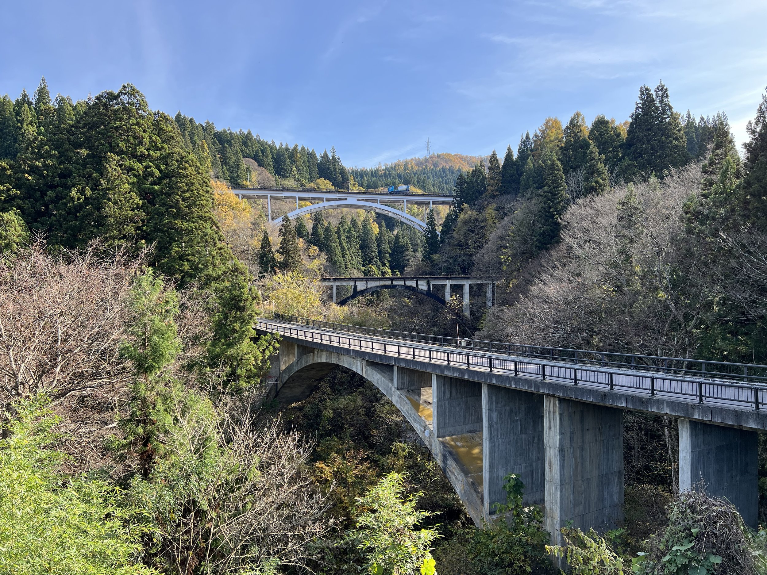 From Aizu-Nakagawa Station, I boarded the train and rode four stops to Aizu-Miyashita Station. This was where the second half of the day really began. From here, I set out on foot again, heading toward one of the more unique viewpoints in the area—the Miyashita Arch Sankyodai Bridges. This spot offers a view of three concrete arch bridges side by side: two road bridges and one railway bridge. Because of their different sizes, they’re often nicknamed “the three brothers.” After spending some time there, I crossed one of the bridges and continued toward my main objective: the iconic Tadami Line train viewpoints.