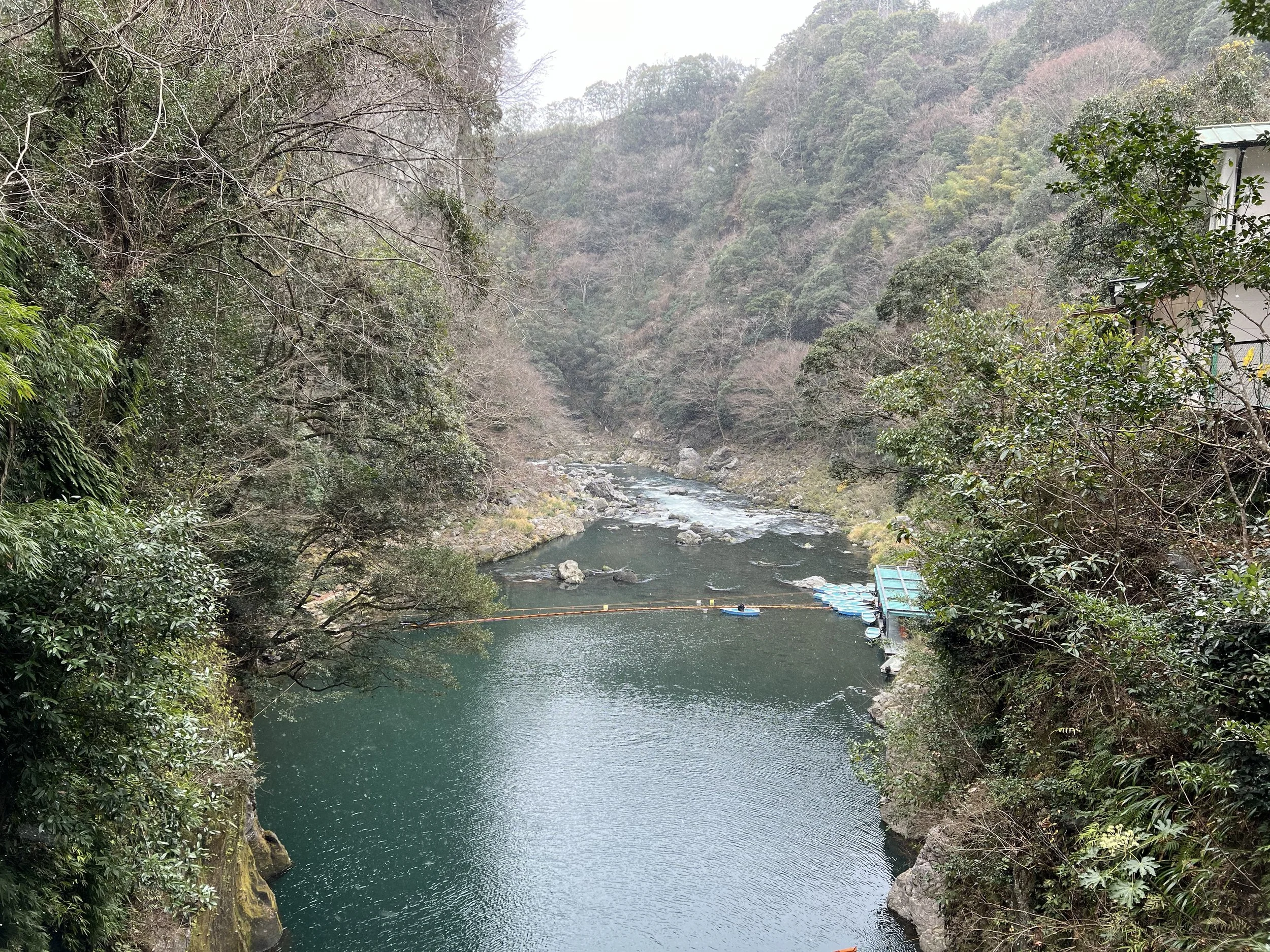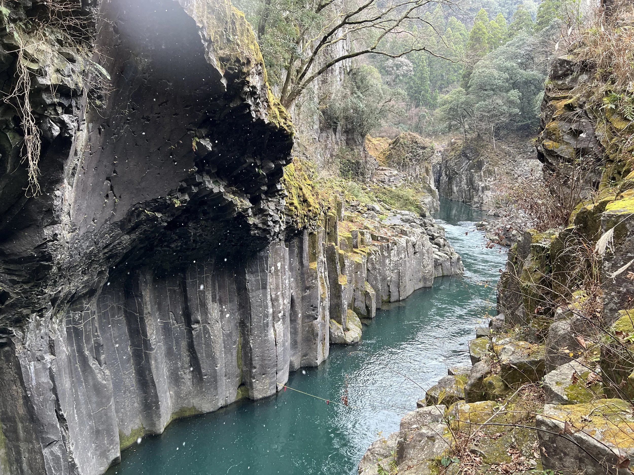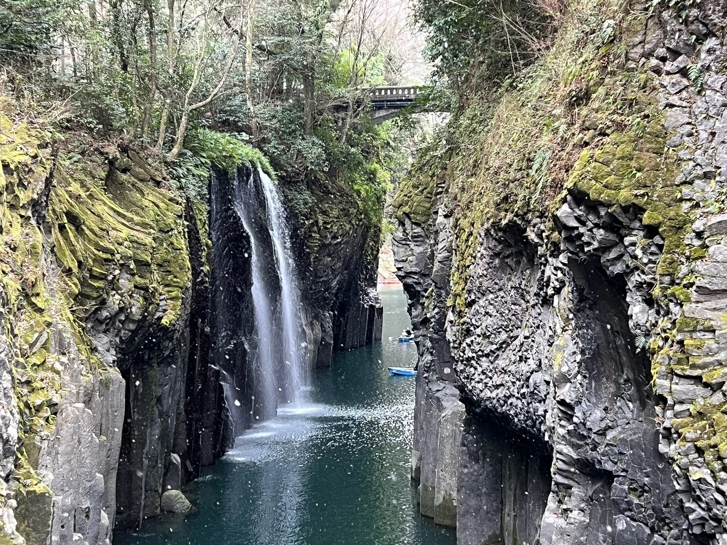 When I arrived at the gorge, it was surprisingly quiet. Winter had settled in, and light snow had just begun to fall. I walked through the small park area and followed the trail toward one of the main viewpoints. From there, I could see the towering basalt columns, Manai Falls cascading into the river, and the striking emerald-green water flowing below. A few rental boats were already on the river, appearing tiny against the scale of the gorge.