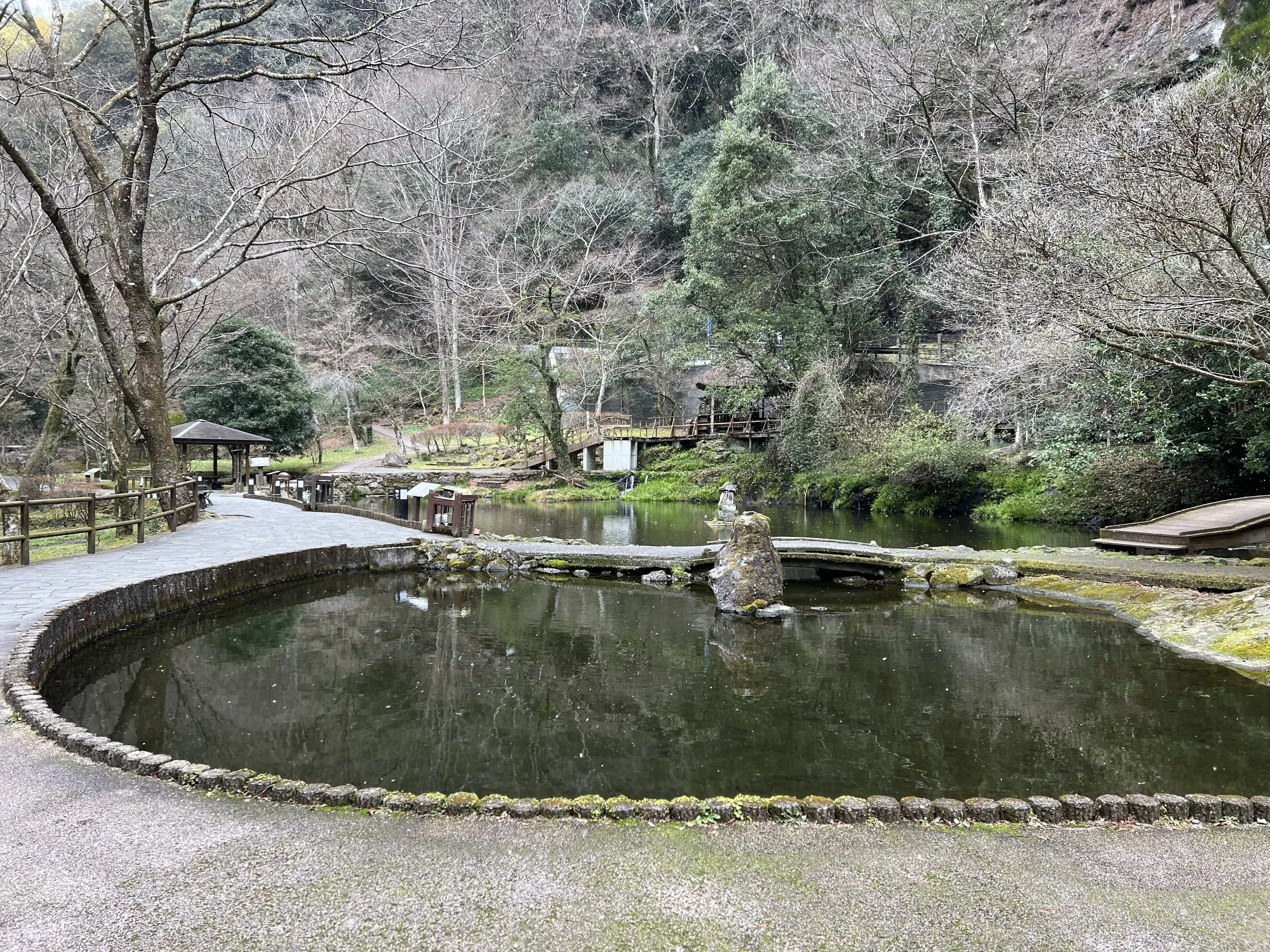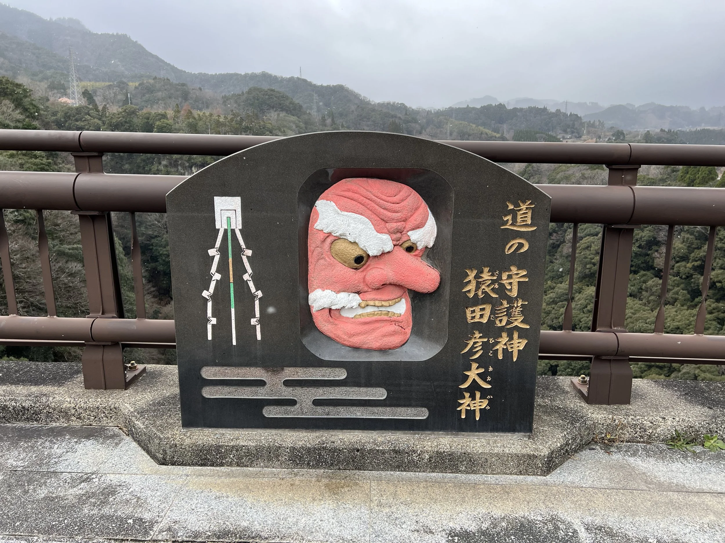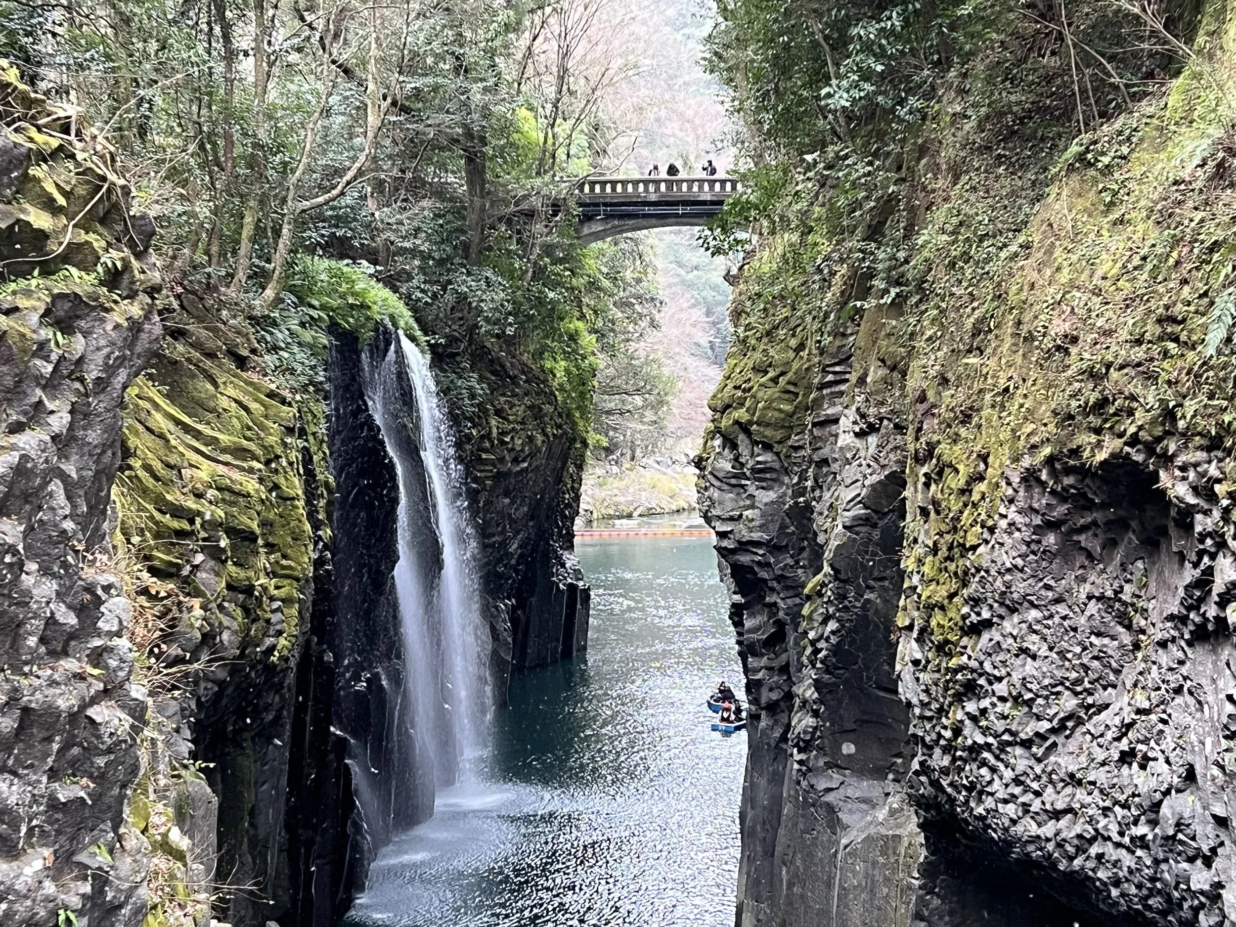 After leaving the gorge, I walked about two kilometres to Aobashi Bridge to get a different perspective of the river below. The bridge offered a wide, open view and featured several decorative monuments adorned with Kagura masks, tying the natural scenery back to Takachiho’s mythological roots. After taking a few photos, I made my way back toward the town centre and stopped at a café for a well-earned meal.