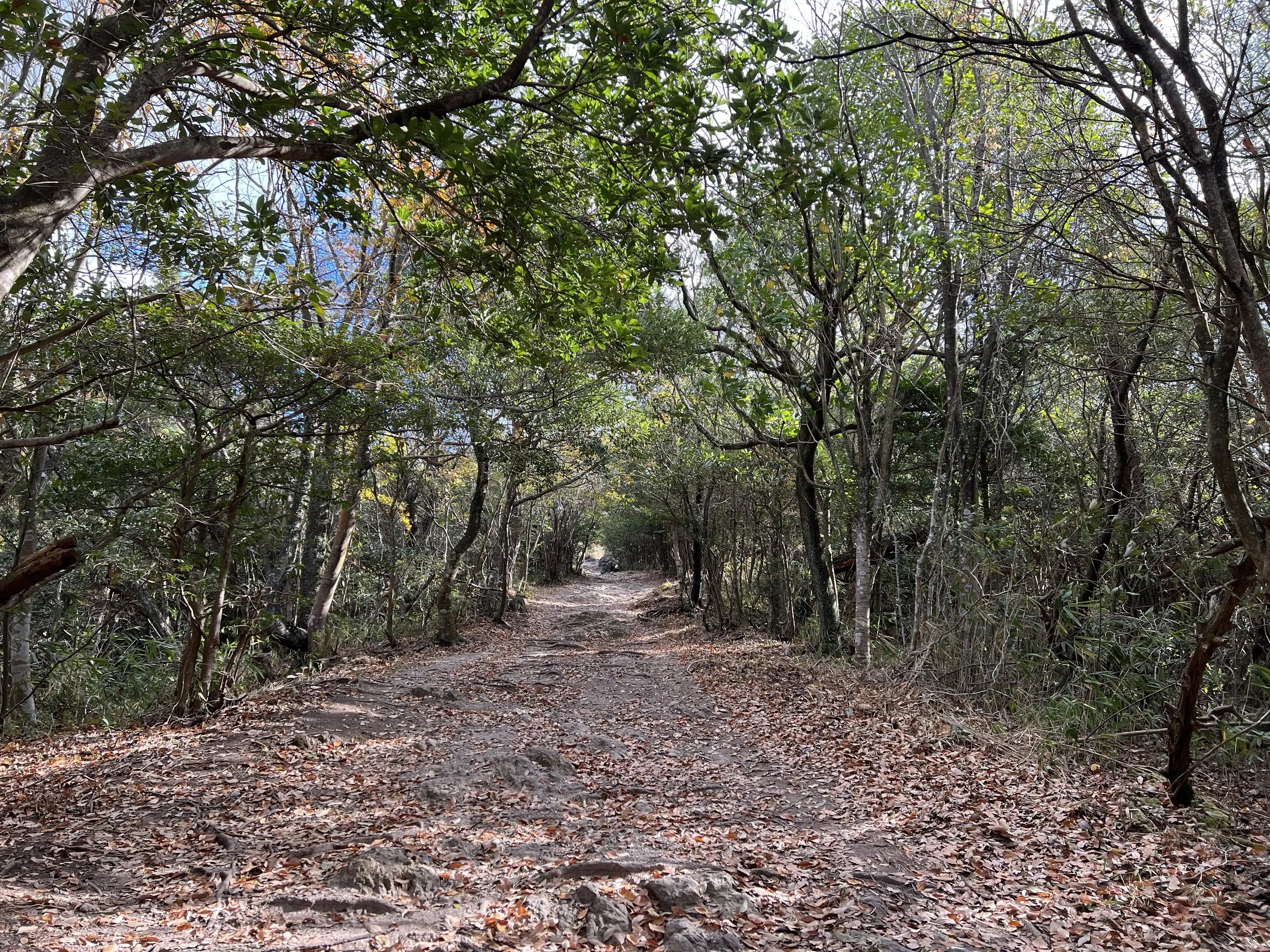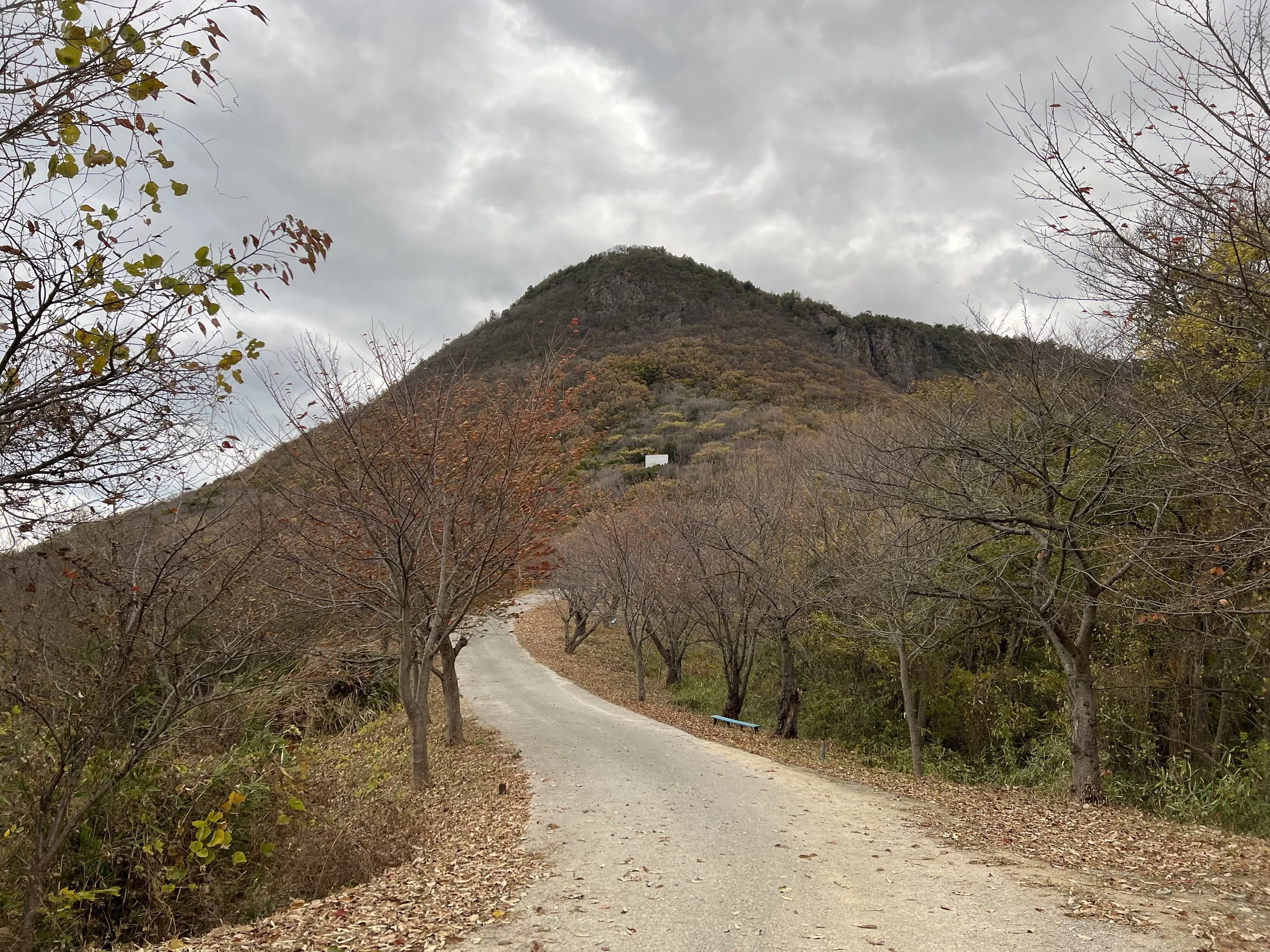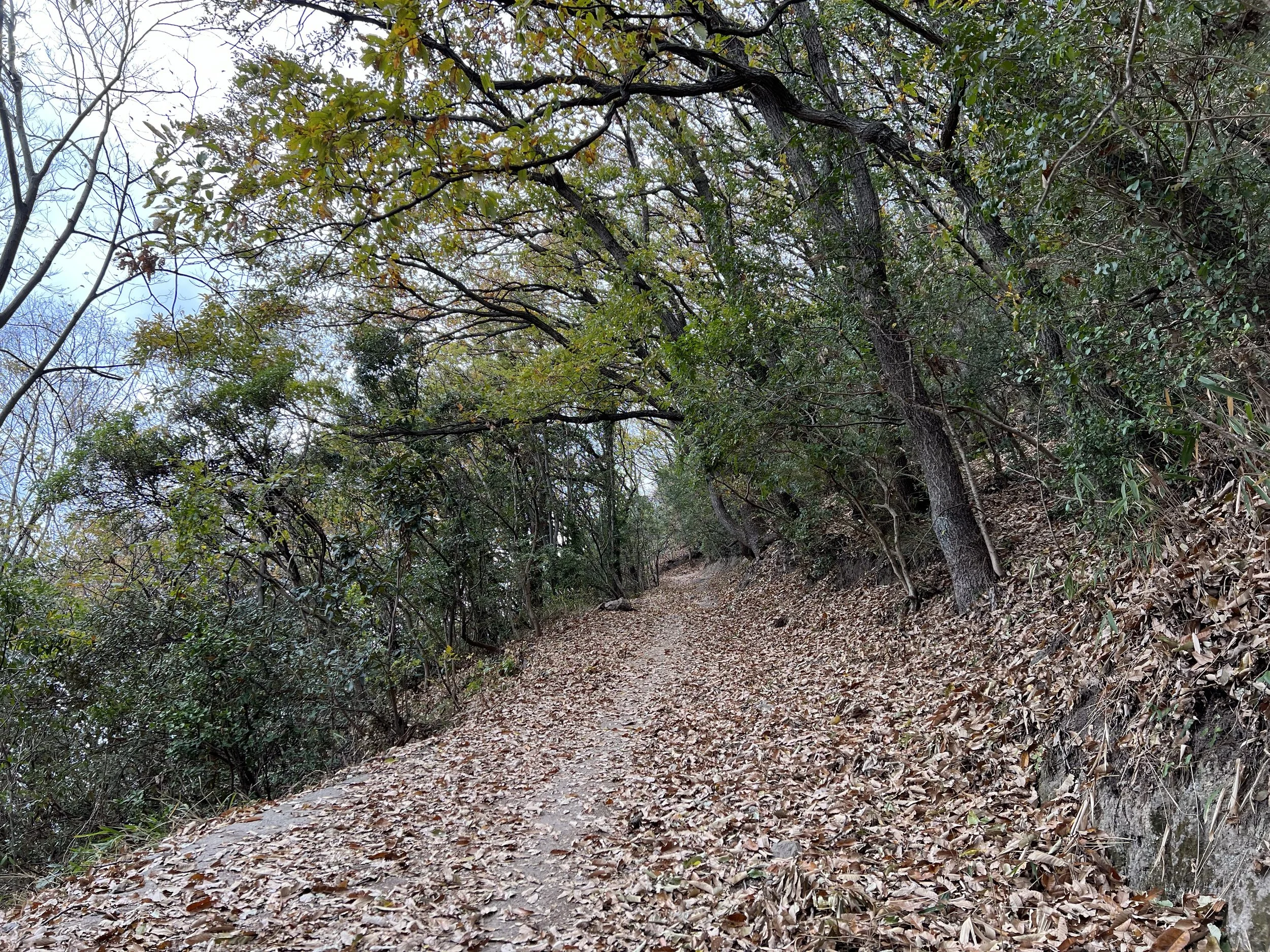 At the lower shrine, I stopped briefly to pay my respects before continuing behind the main building to the trailhead. A sign at the entrance reminded hikers that they proceed at their own risk. The first part of the trail was wide and well maintained, but as I climbed higher, the switchbacks began—one after another. The path was covered in fallen leaves and sandy soil, making some sections quite slippery. Along the way, several side trails branched off, leading to small shrines, unusual rock formations, and scenic viewpoints overlooking the city below.