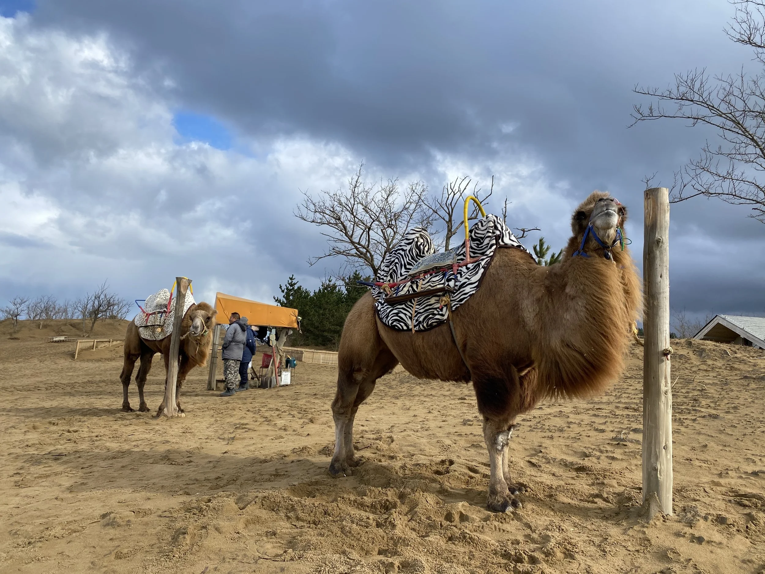 After that, I made my way over to where the camels were stationed. Visitors can pay for a short camel ride and have their photos taken, and from what I learned, the camels are well cared for. They don’t operate in poor weather, rides are limited each day, and they aren’t available daily, so it’s important to check in advance. I decided to go for a short ride and photos. Riding a camel in a desert-like landscape in Japan felt surreal. The handler led the camel around a small loop while helping take photos, and once we returned to the platform, I was allowed to take additional pictures of the camels resting. I kept a respectful distance and spent a few moments photographing the two camels before moving on.