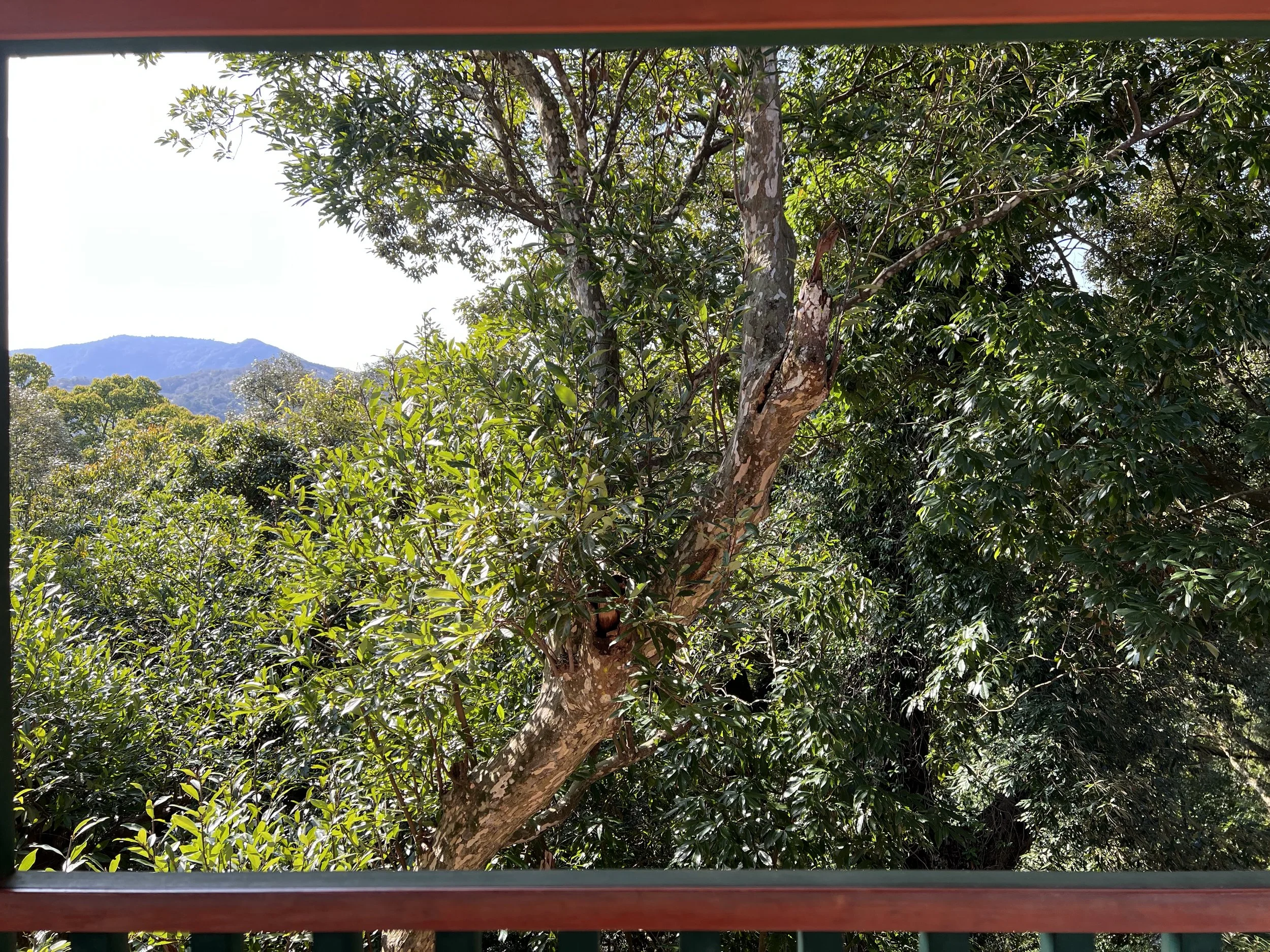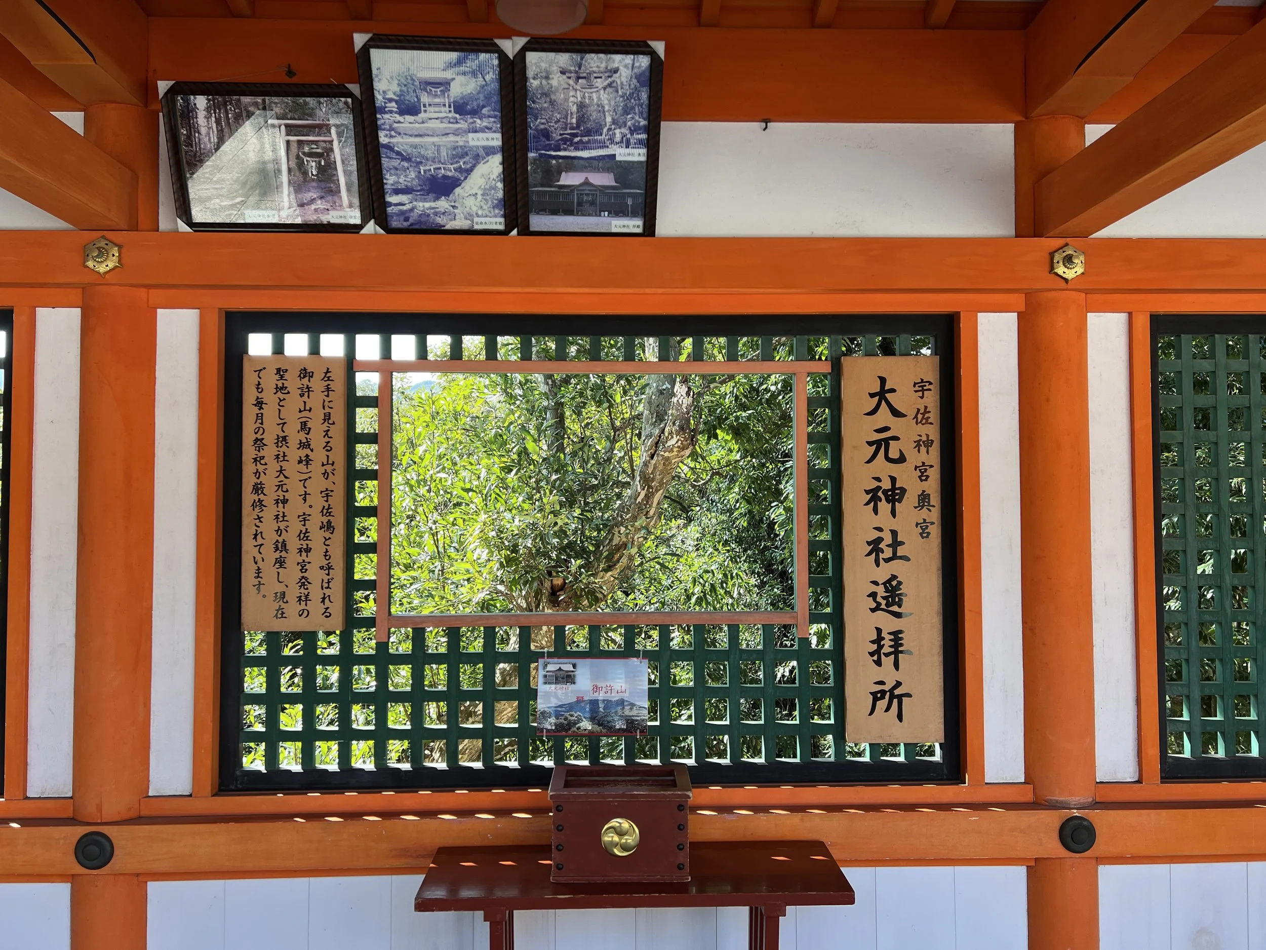 I made my way up the stone steps toward the upper shrine, surrounded by towering trees that made the ascent feel both serene and solemn. The climb would certainly be challenging for elderly visitors, wheelchair users, or those with strollers, though I learned that a monorail operates to assist visitors—though I didn’t encounter its lower station along the main approach. At the top, several prayer areas are arranged across the grounds. One spot that stood out to me was the remote prayer area for Omoto Shrine. The actual shrine lies deep within the forested mountains and usually requires a proper hike to reach. This area is also known as a training ground for monks. From the designated window frame at the prayer spot, I tried to glimpse the distant shrine, even though I was told it’s not usually visible.