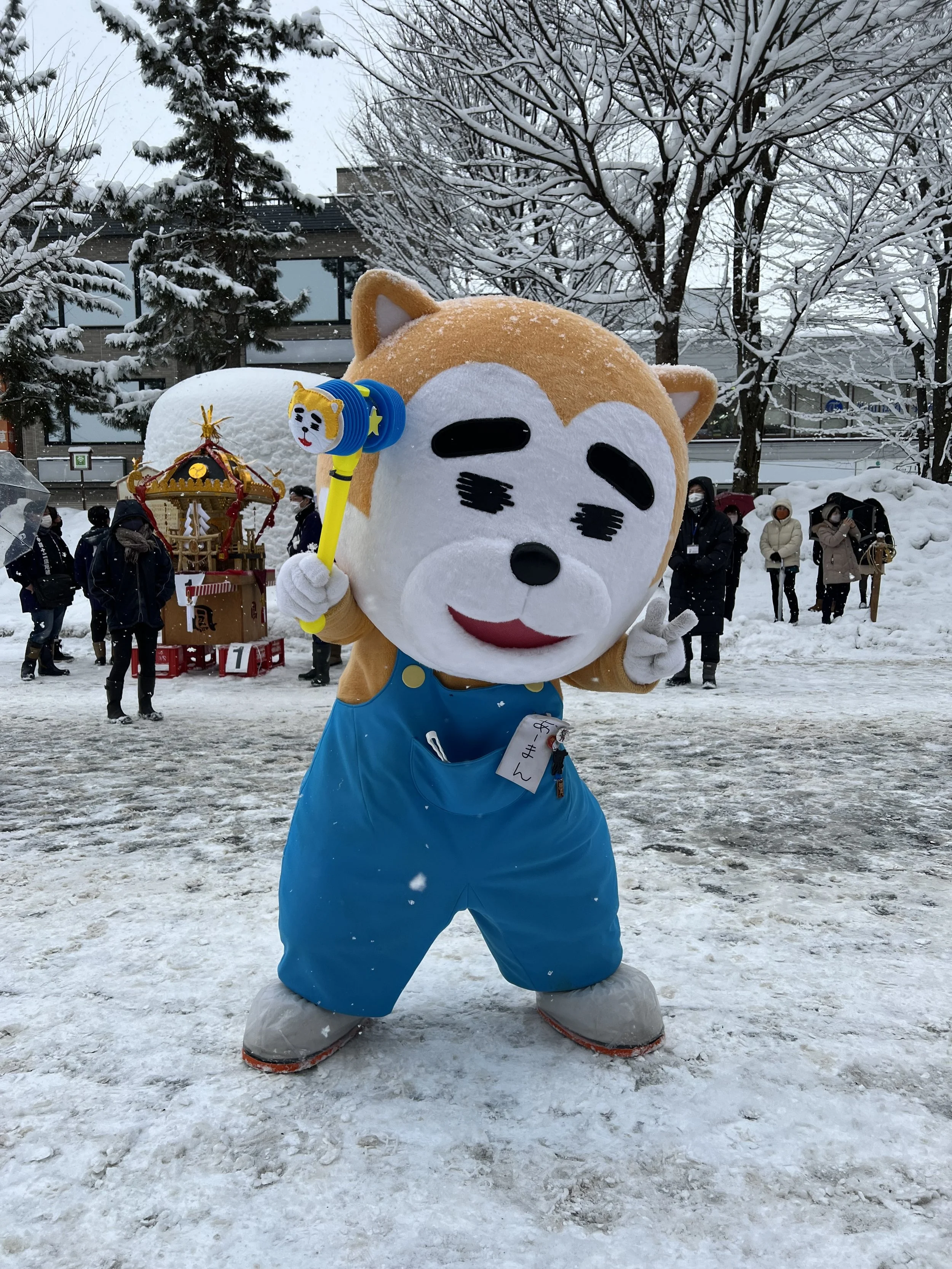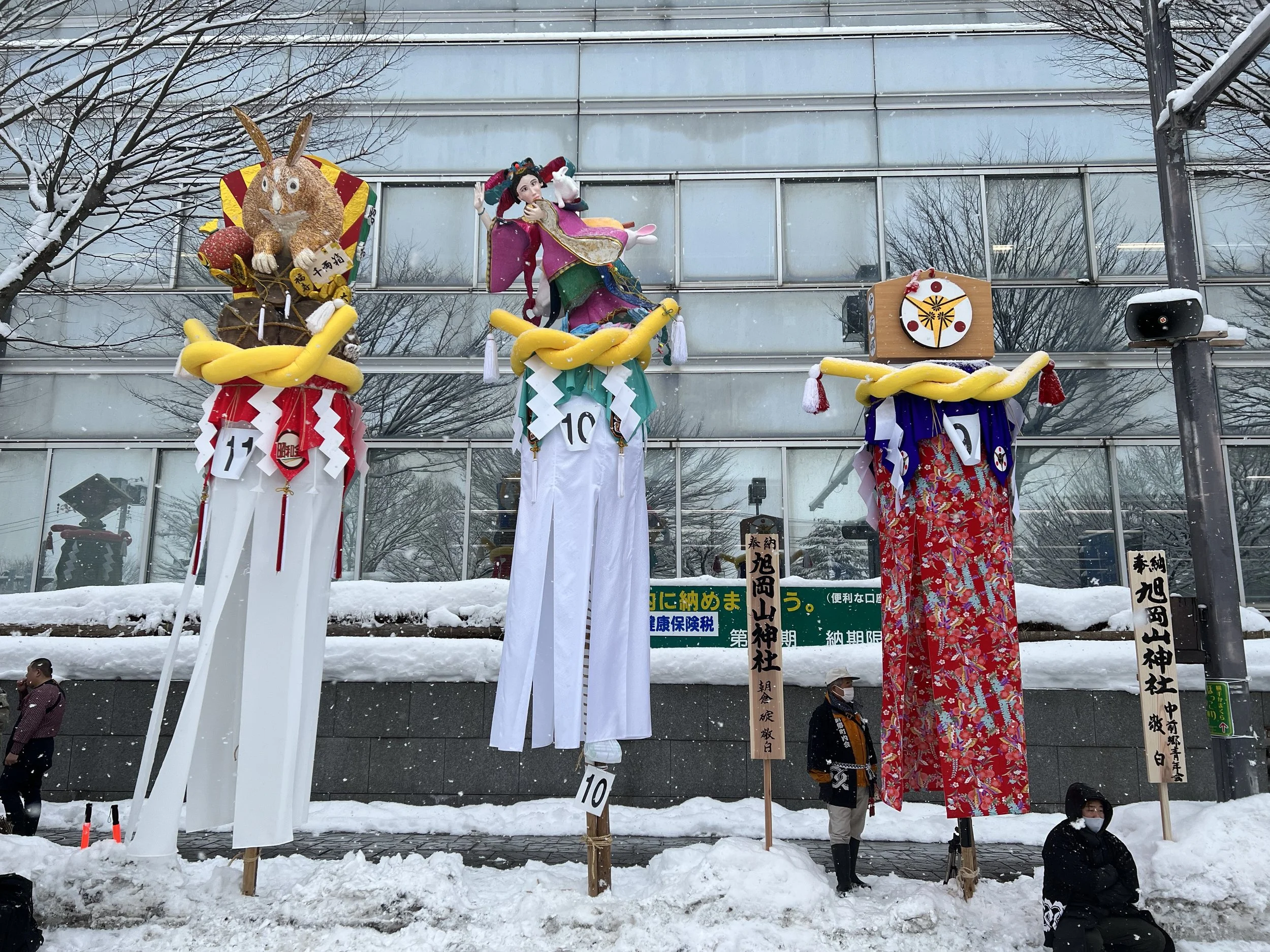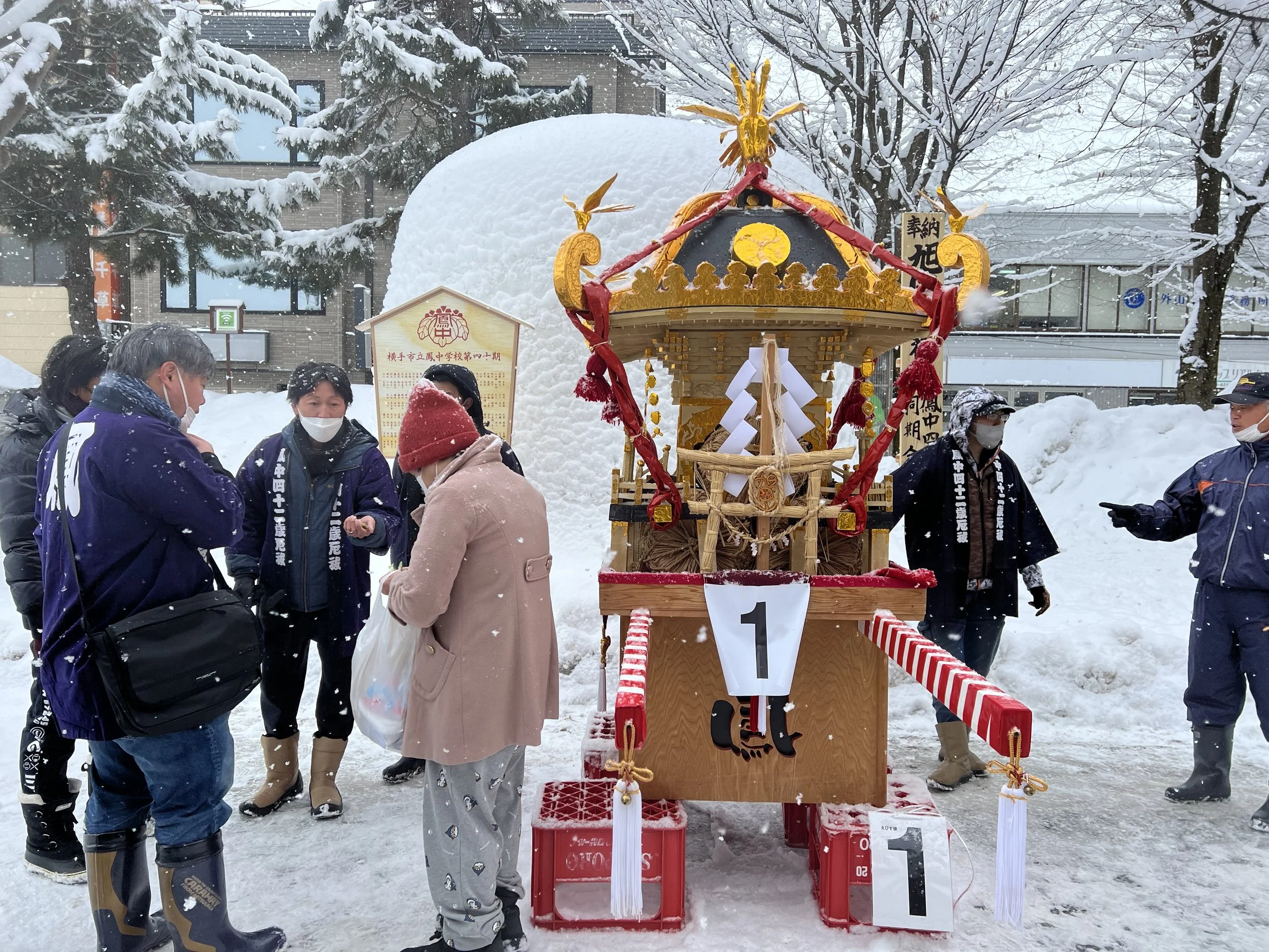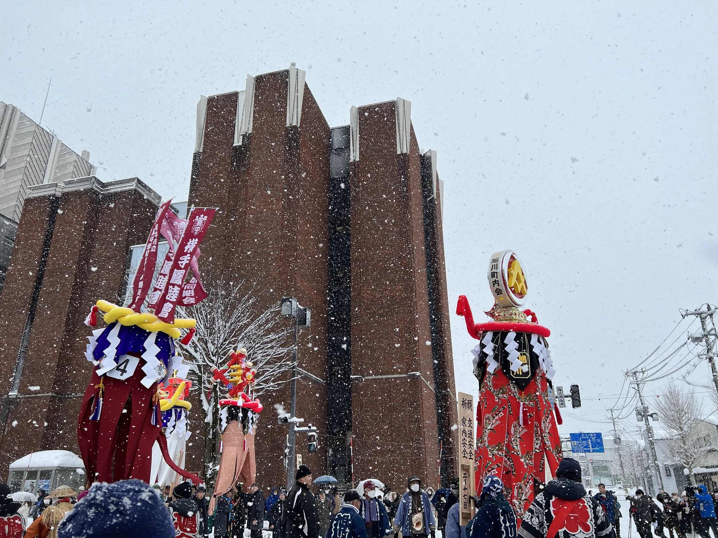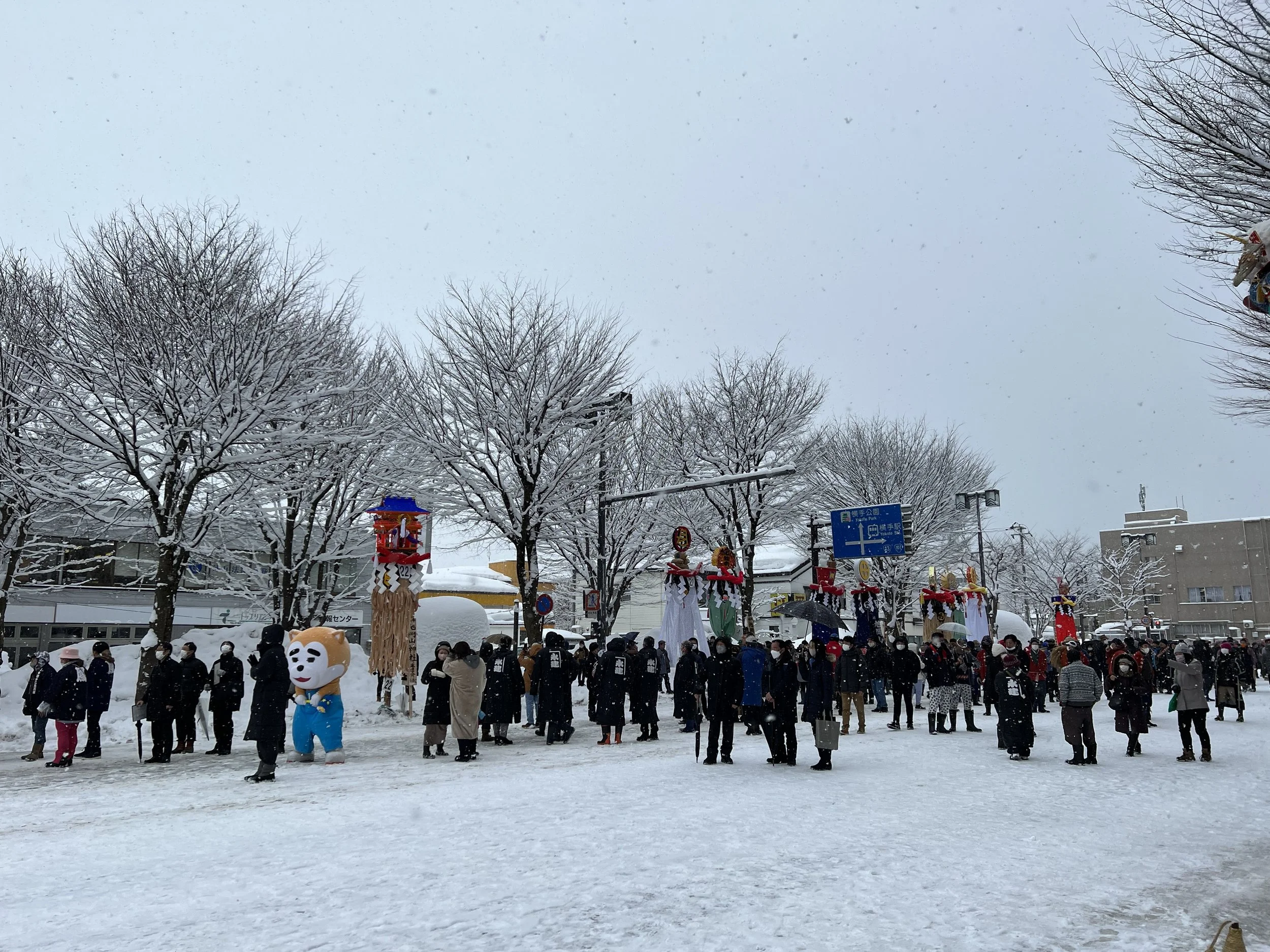 After experiencing the Yokote Kamakura Festival the night before, I returned the following morning for the Yokote Bonden Festival, another cornerstone of Yokote’s annual snow celebrations. Unlike the evening-focused Kamakura Festival, the Bonden Festival showcases decorated staves called Bonden, which are paraded through the city and eventually presented as offerings at Asahiokayama Shrine. In Shinto tradition, each Bonden temporarily houses the spirit of a kami—a divine being—and the staves are intricately decorated by the different local groups that craft them.