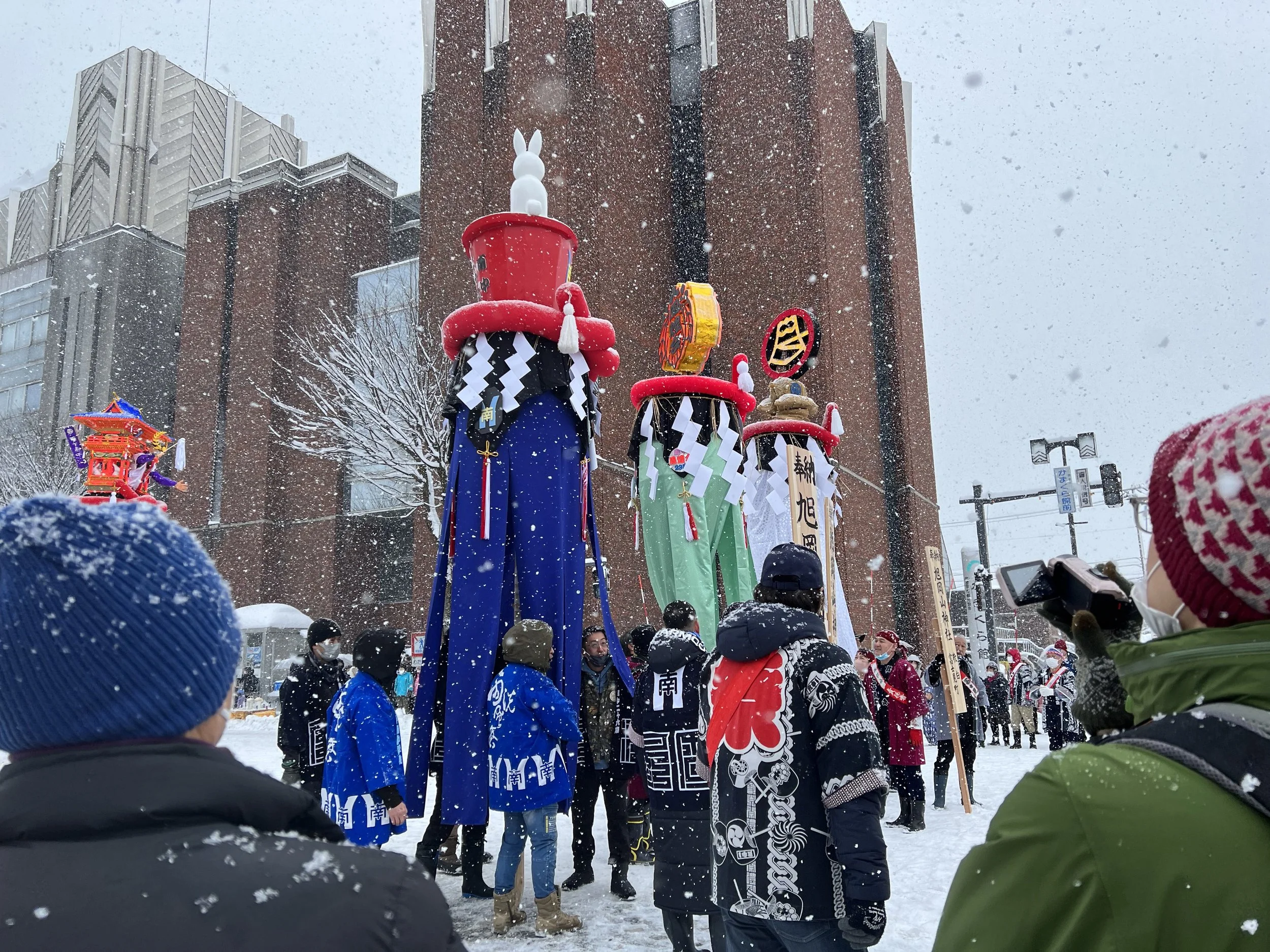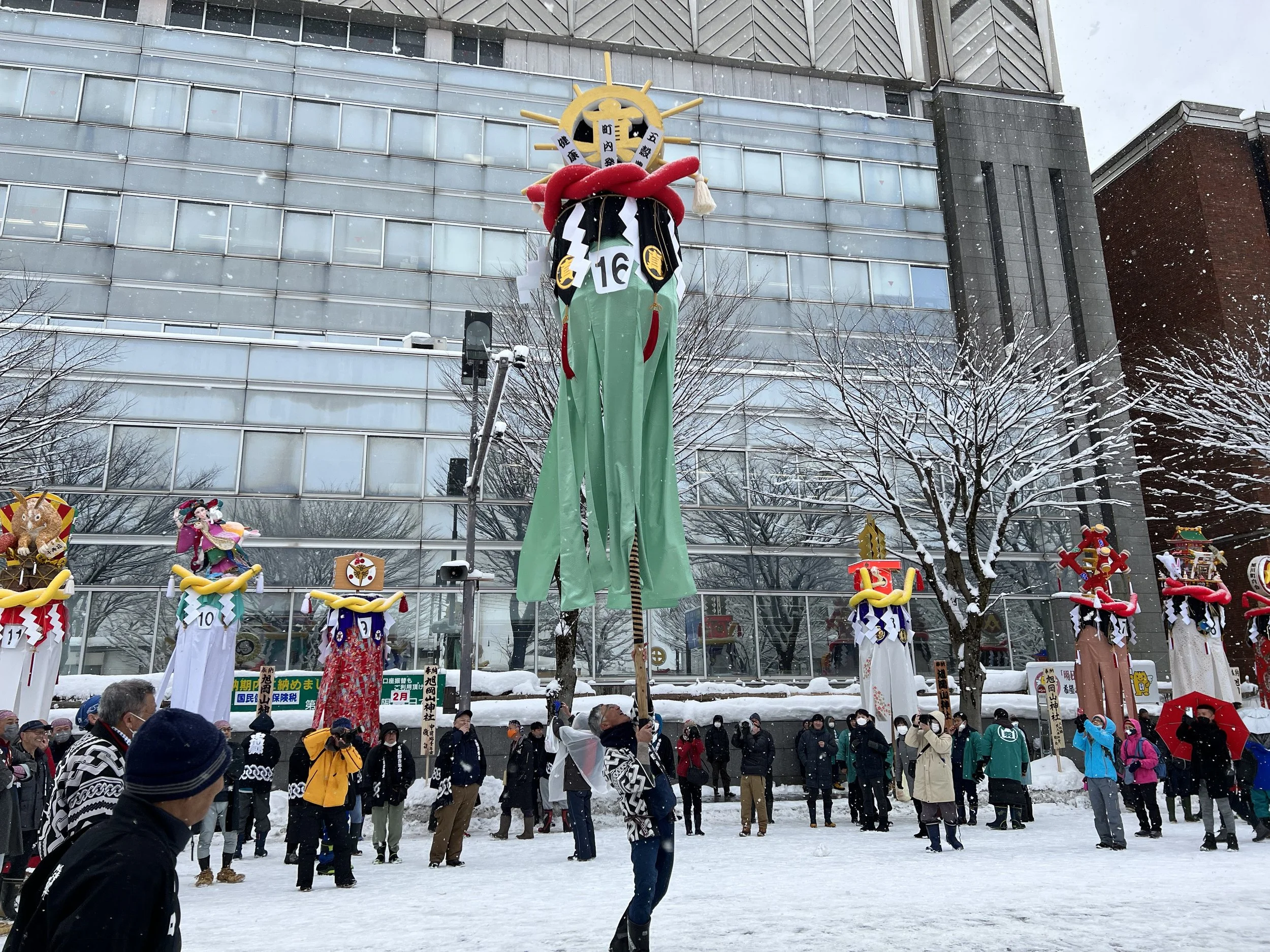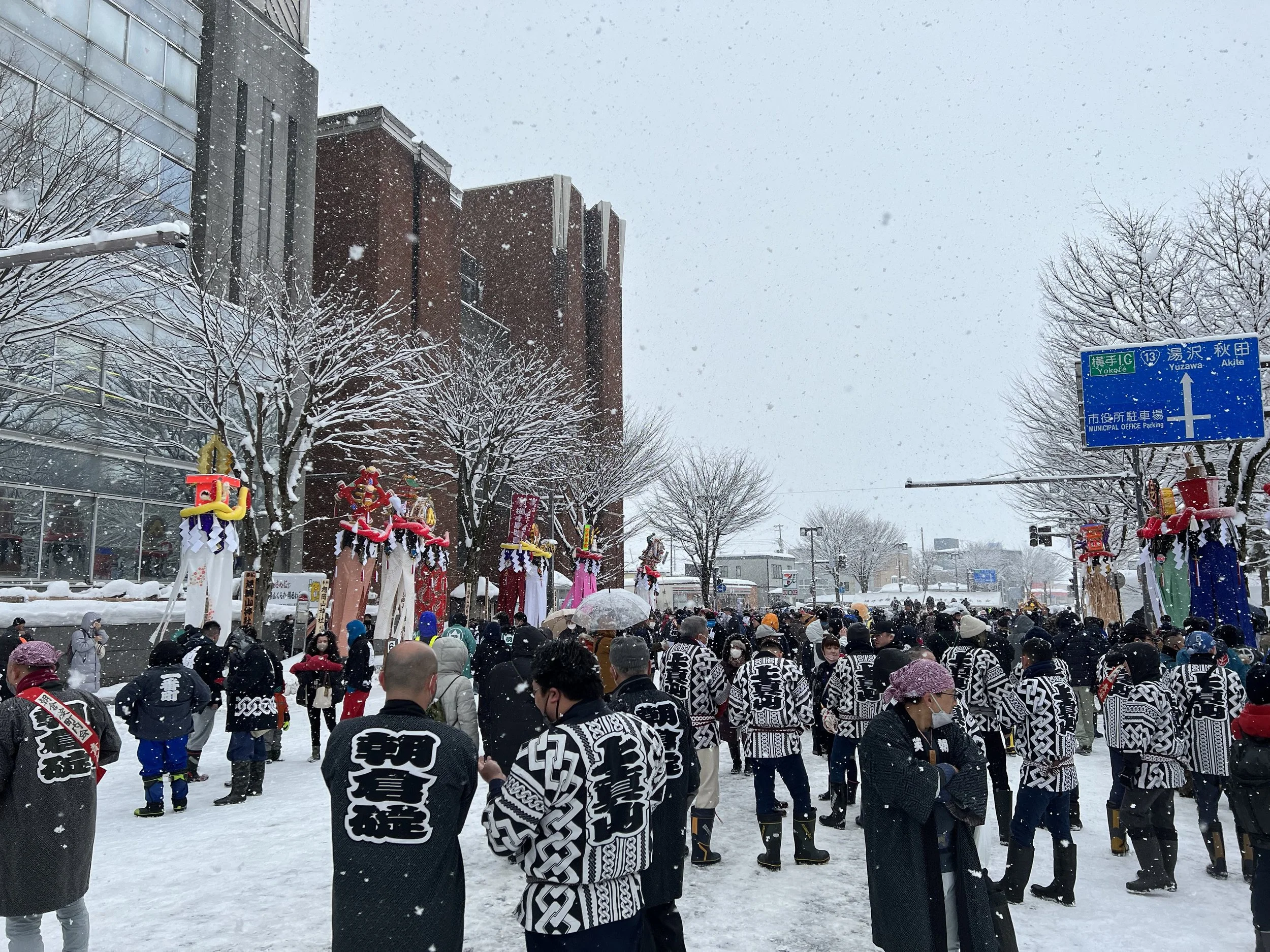 The festival also features a judging competition near the city hall, where Bonden are evaluated on their design, craftsmanship, and presentation. Some of these impressive staves can reach up to five metres in height and weigh as much as 30 kilograms. Despite heavy snowfall, a dedicated crowd had gathered to witness the festival unfold. Walking among the participants, I was amazed at the variety and creativity of the designs. I counted over twenty groups, each presenting highly detailed and colourful Bonden. Some looked almost impossibly heavy, yet participants lifted, tossed, and even juggled them with astonishing skill.