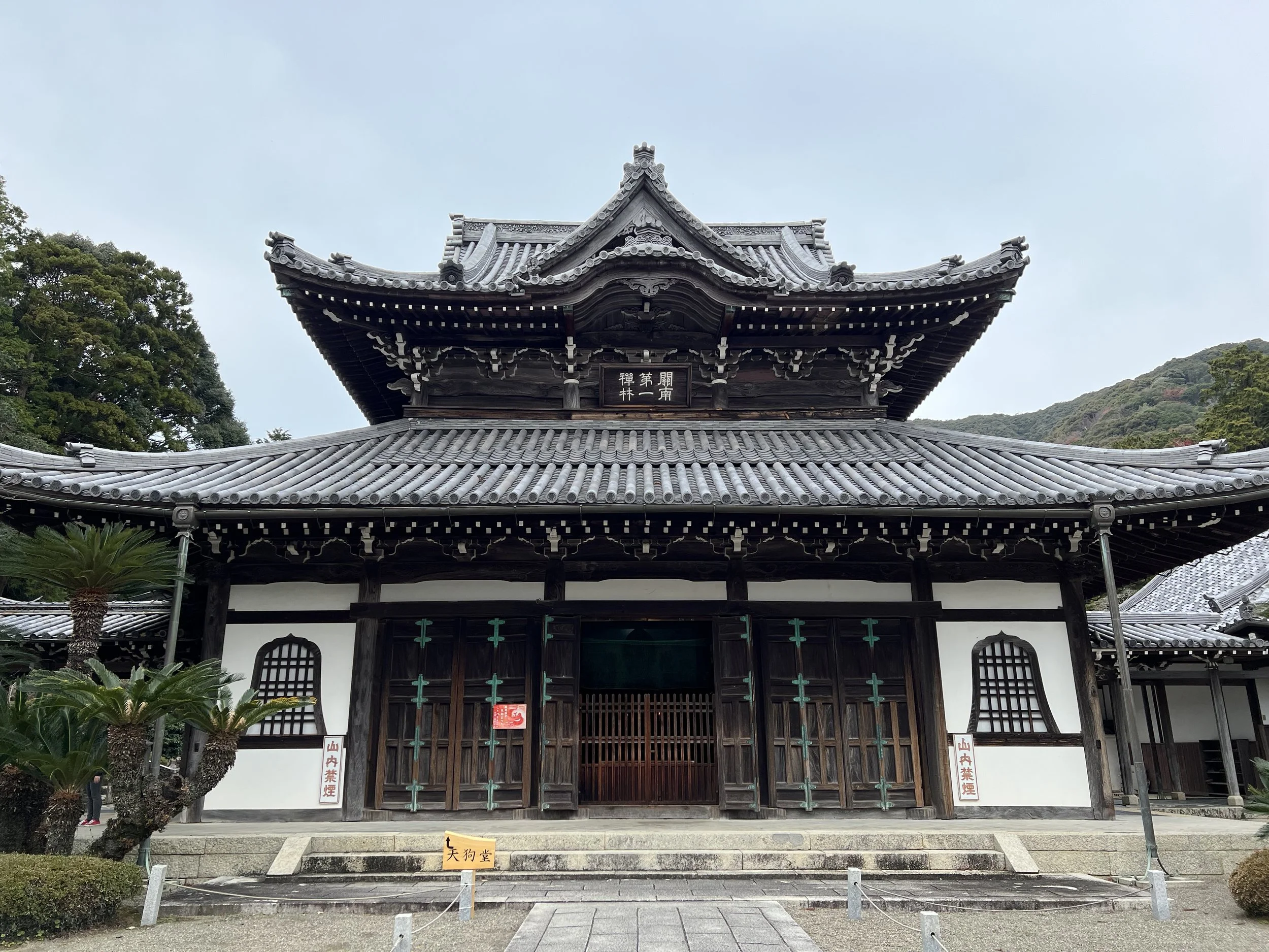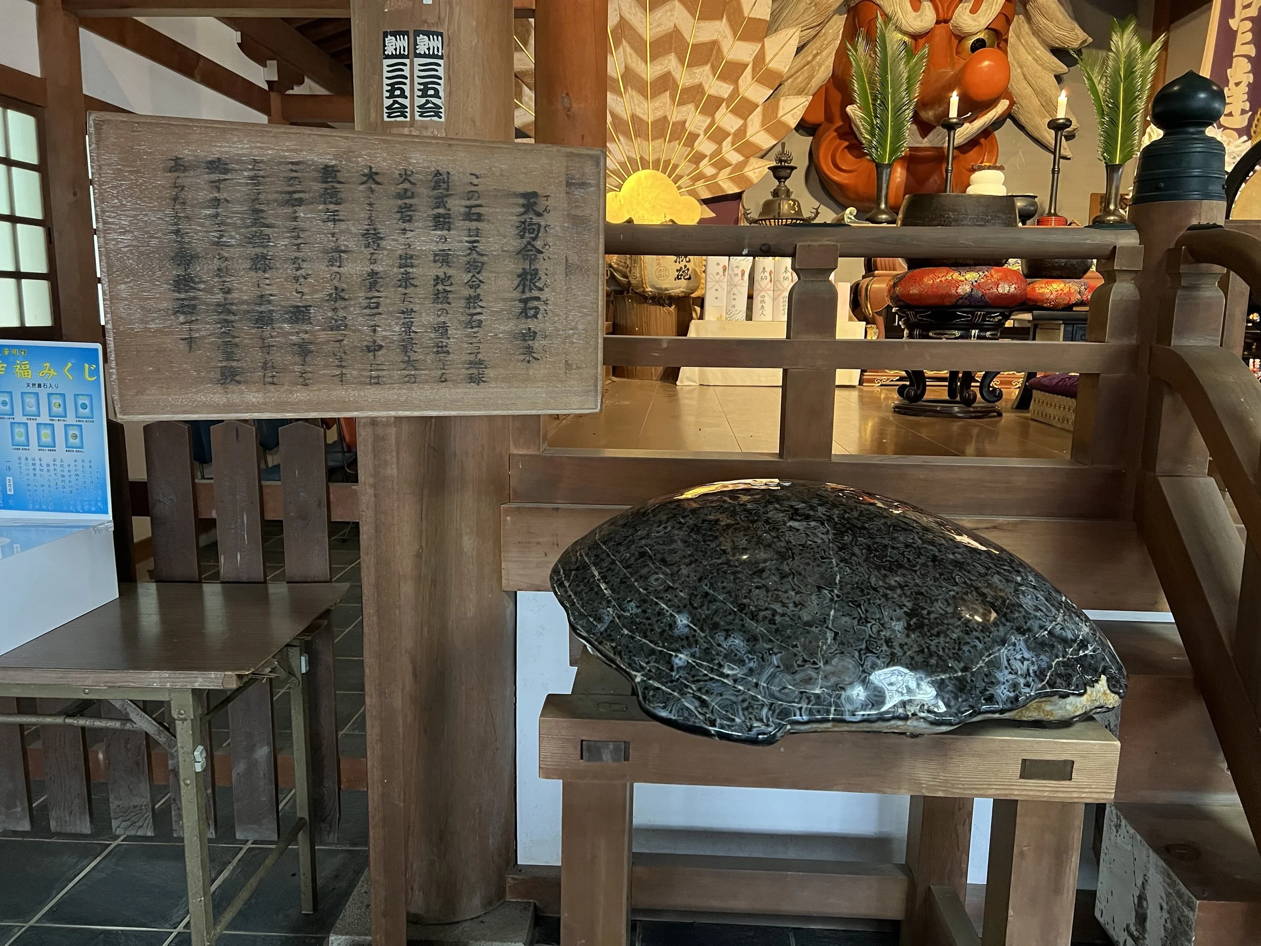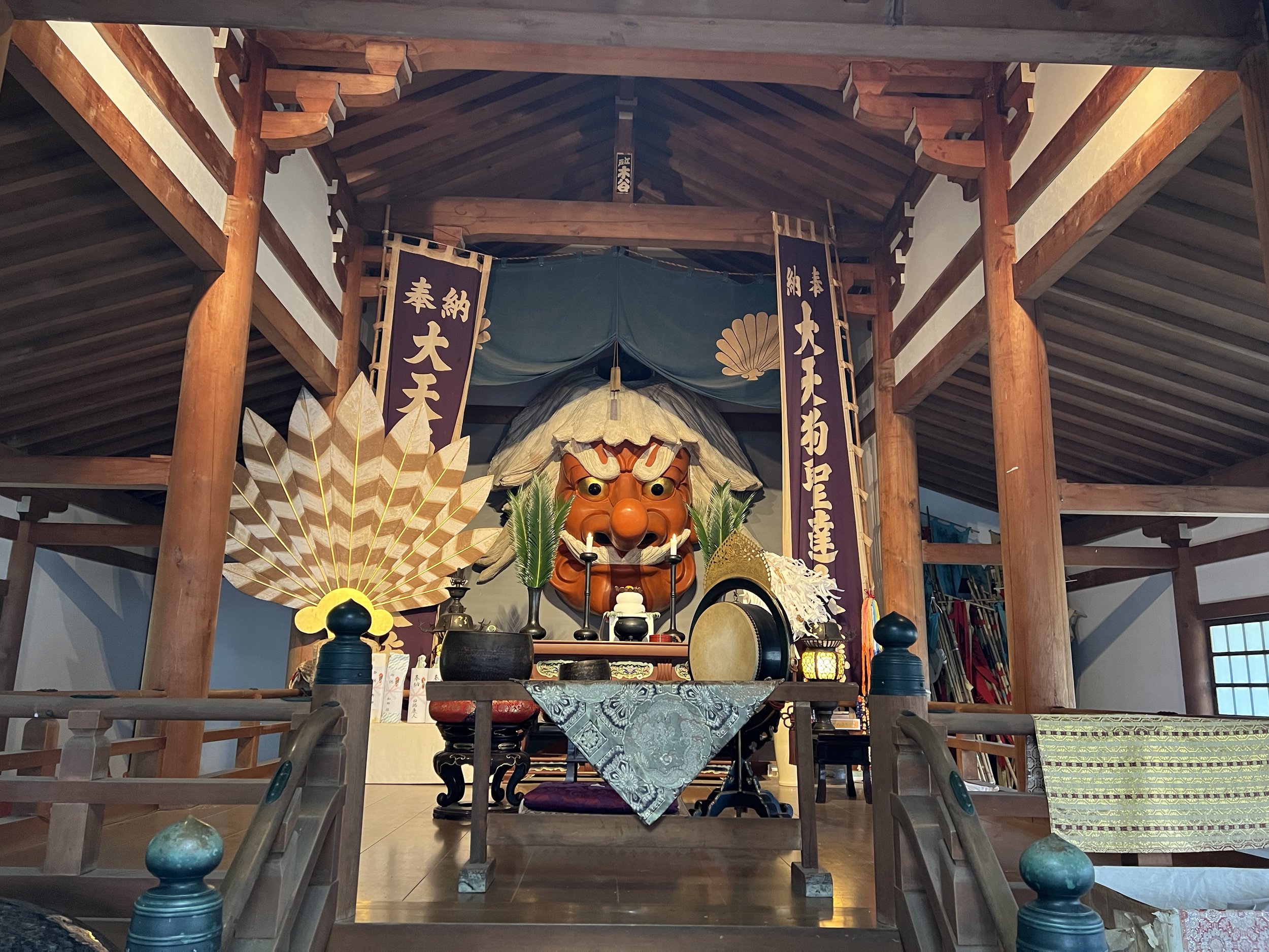 Walking through the quiet temple grounds, surrounded by forested hills, I soon came across a hall dedicated specifically to the Tengu. These legendary beings are often depicted with bright red faces, long noses, and wings. Inside the hall stood a large Tengu mask mounted above the altar, its exaggerated features immediately recognizable. Tengu are believed to be guardians of the natural environment, particularly in mountainous regions, and hikers and pilgrims often pray to them for protection while travelling through the mountains. They are also associated with protection against fires and natural disasters.