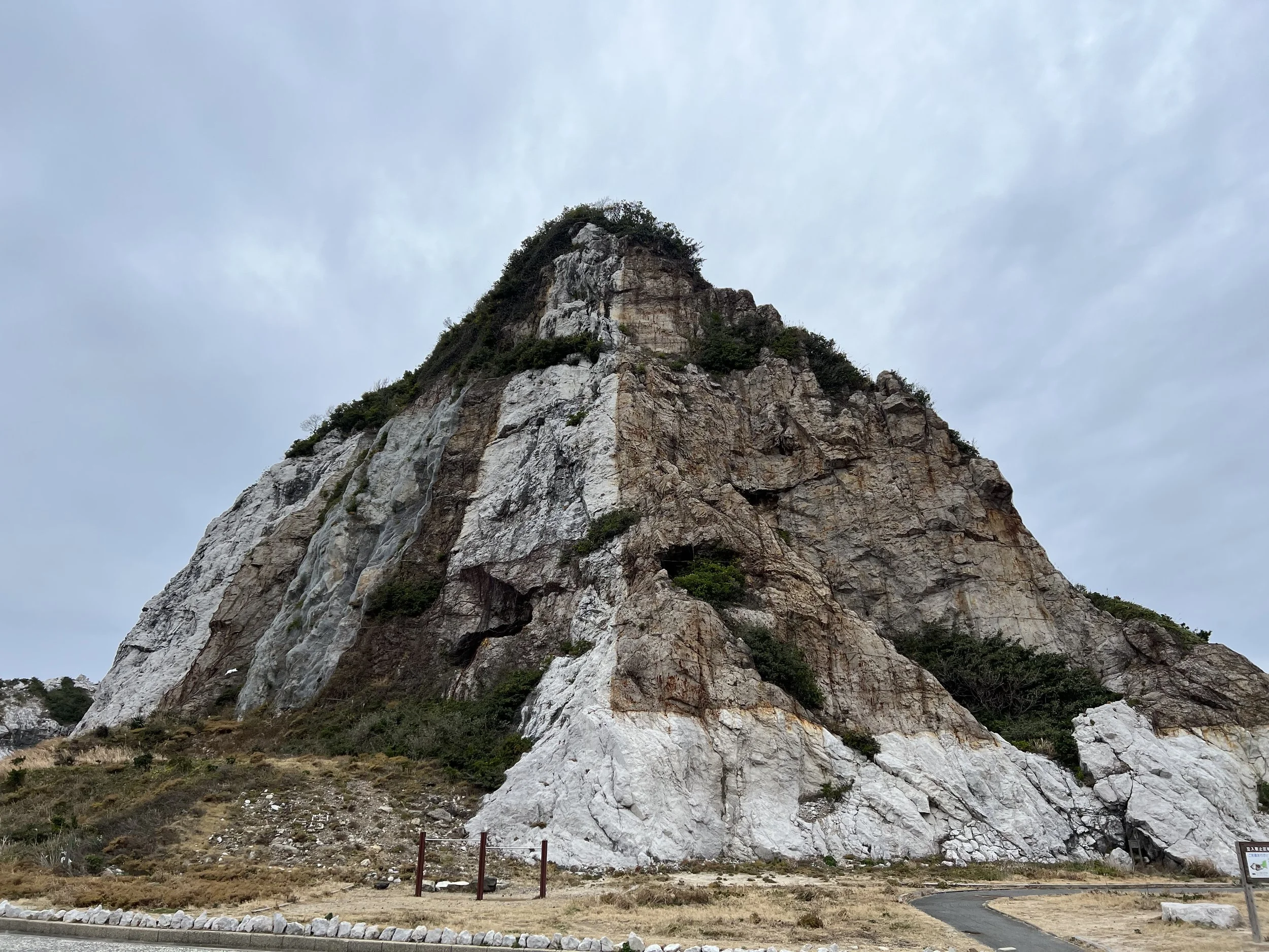 The road leading toward Totsui Limestone Cave follows one of these cycling routes, marked by a blue line painted along the pavement. The route climbs gradually higher into the hills, which also provides better vantage points over the coastline. Eventually I reached a fork in the road where the path climbs further into the mountains toward the cave. Thankfully, there was a sign right there indicating whether the cave was open that day, as the entrance itself lies another 650 metres up the narrow mountain road.