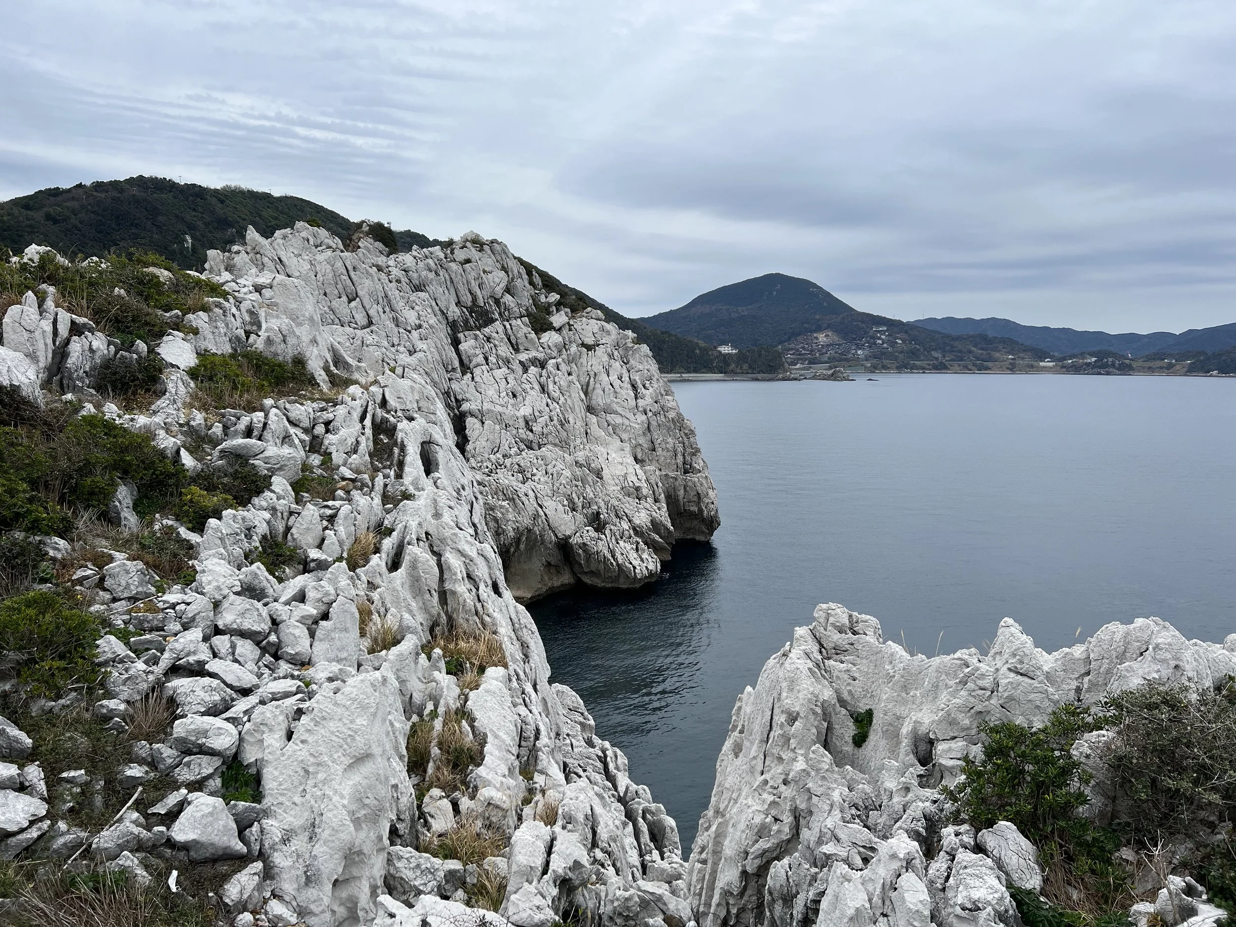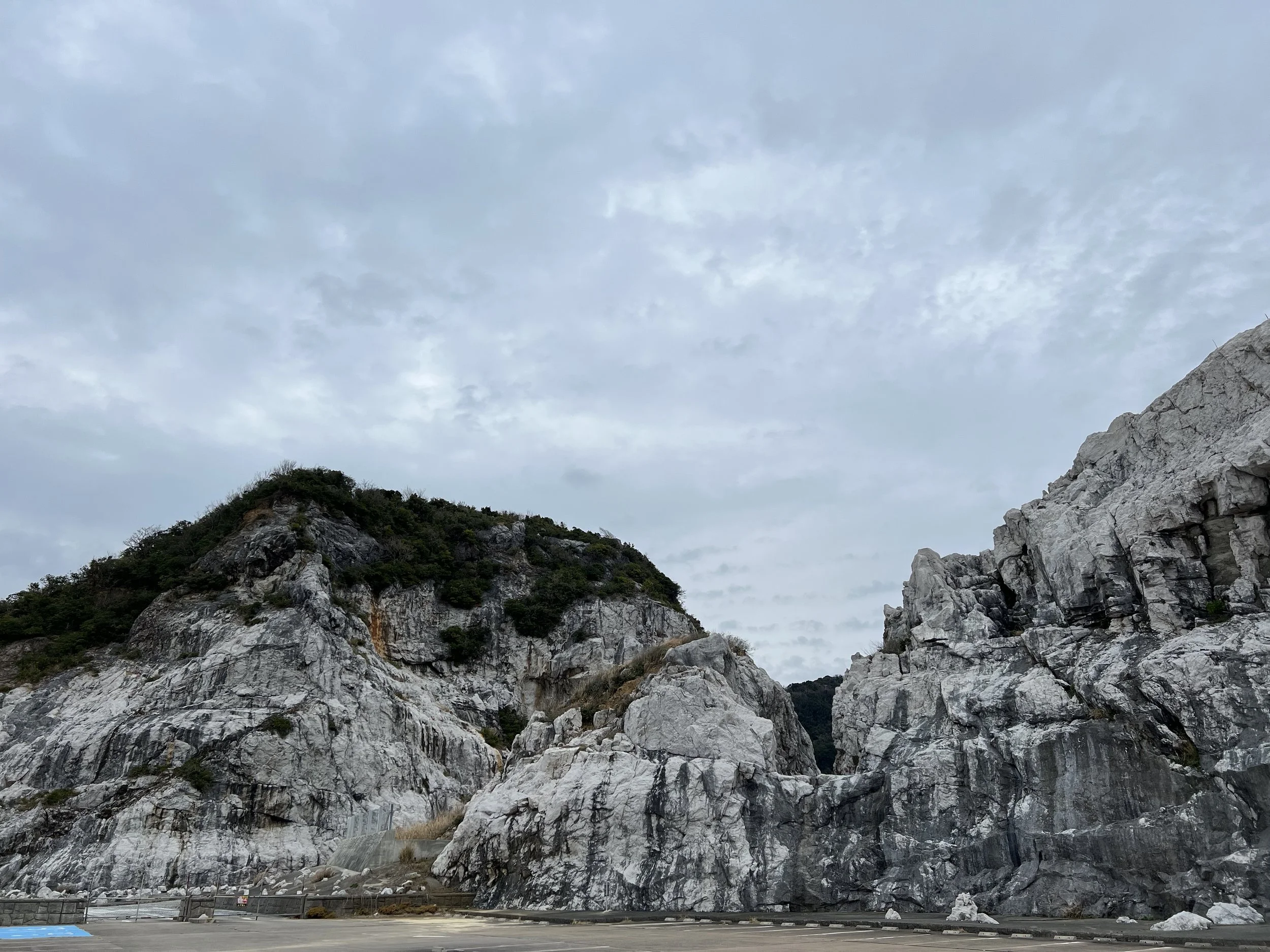 Once I felt better, I continued down the mountain road until it rejoined the main coastal road toward Shirasaki Marine Park. From the limestone cave, it’s about five kilometres on foot to the park, following the coastline the entire way. The views along this stretch were fantastic, though the road shoulder was quite narrow on one side, so I ended up walking with the direction of traffic rather than against it.