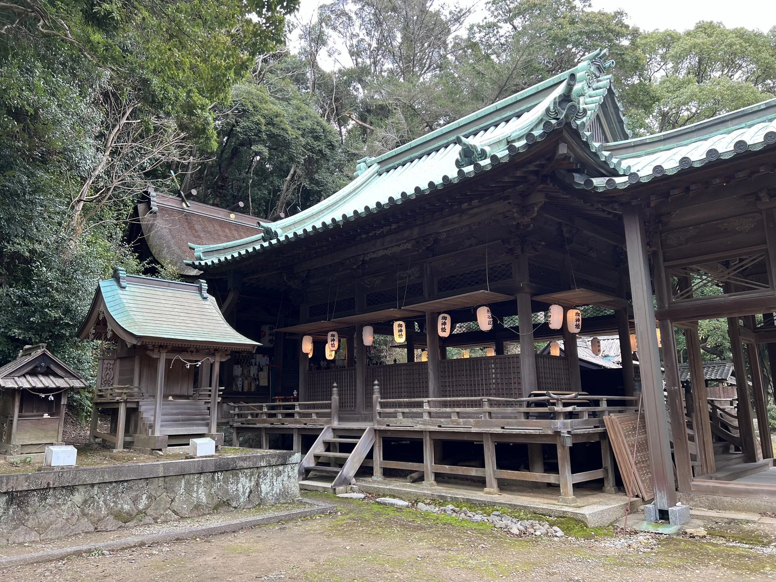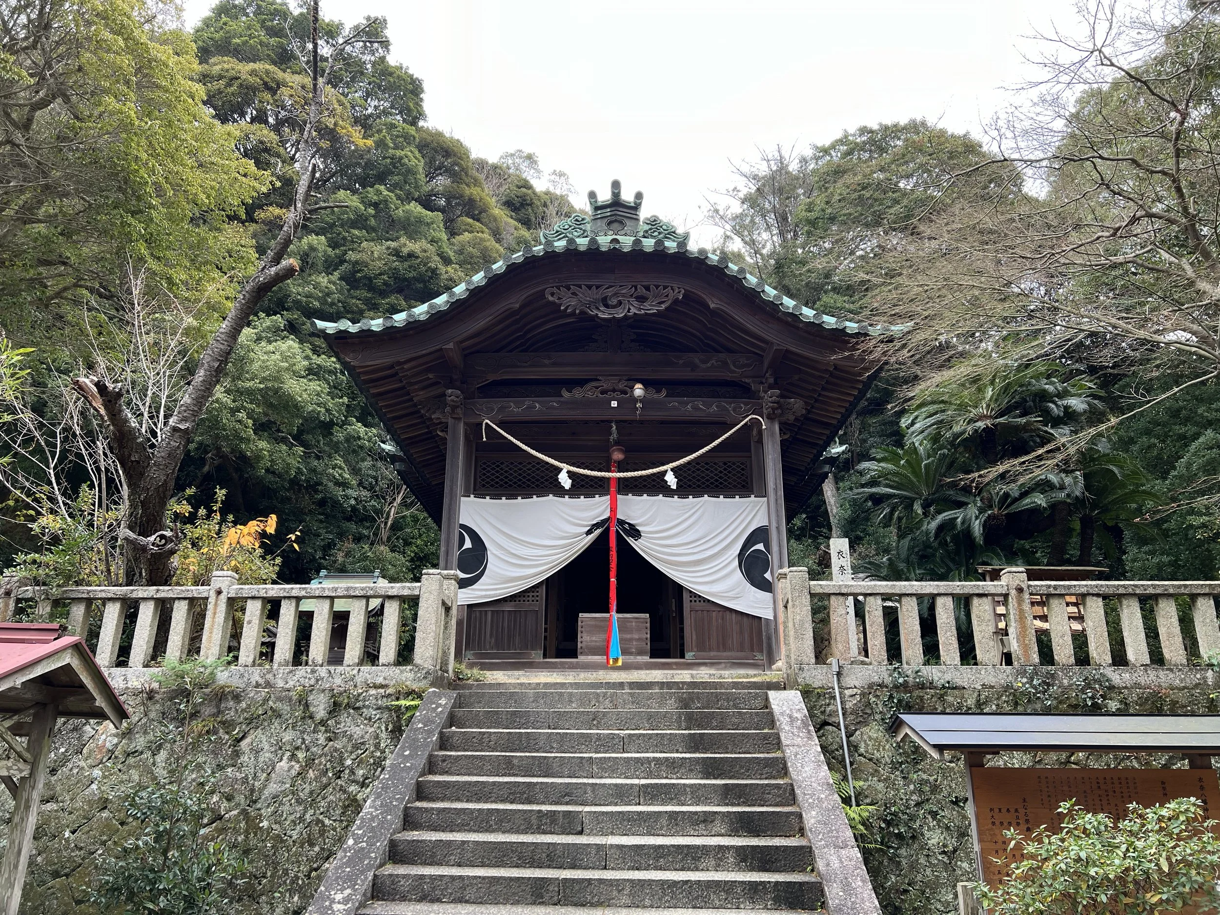 There were a few small benches inside the hall, and I sat there for a moment simply taking in the sight of the giant mask. Afterward, I followed a short trail behind the temple that leads up into the hillside to several smaller shrines tucked into the forest. Once I had finished exploring the grounds, I returned to the road and continued walking toward my next destination: Ena Hachiman Shrine, about 2.3 kilometres away.