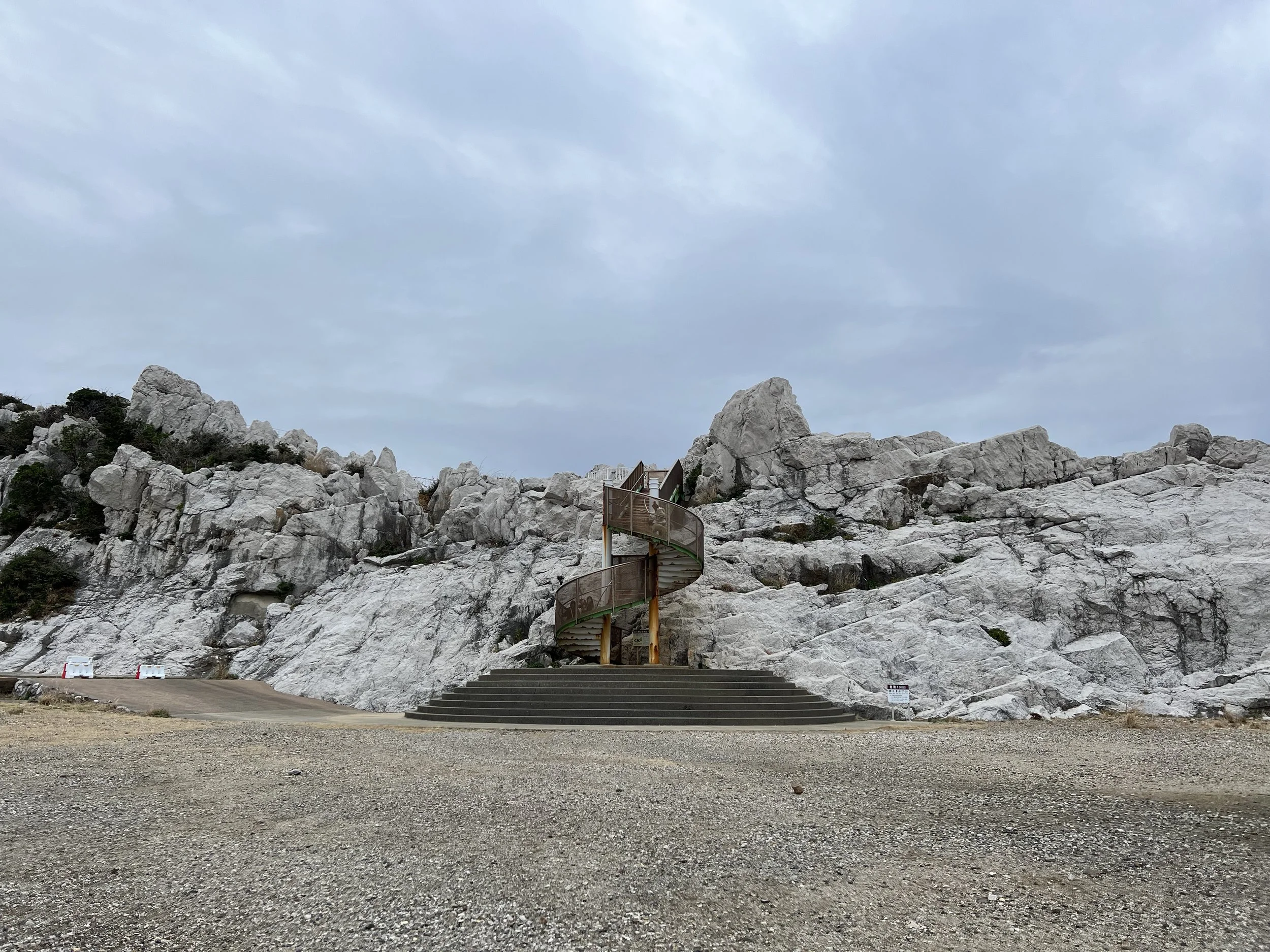 Continuing along the path, I climbed up to one of the observation decks overlooking the cliffs. The stairs rise roughly two storeys before connecting to a walkway that brings you close to the limestone formations. Seeing the brilliant white rock up close was impressive. I spent quite a while there taking photos from different angles before eventually heading back down.