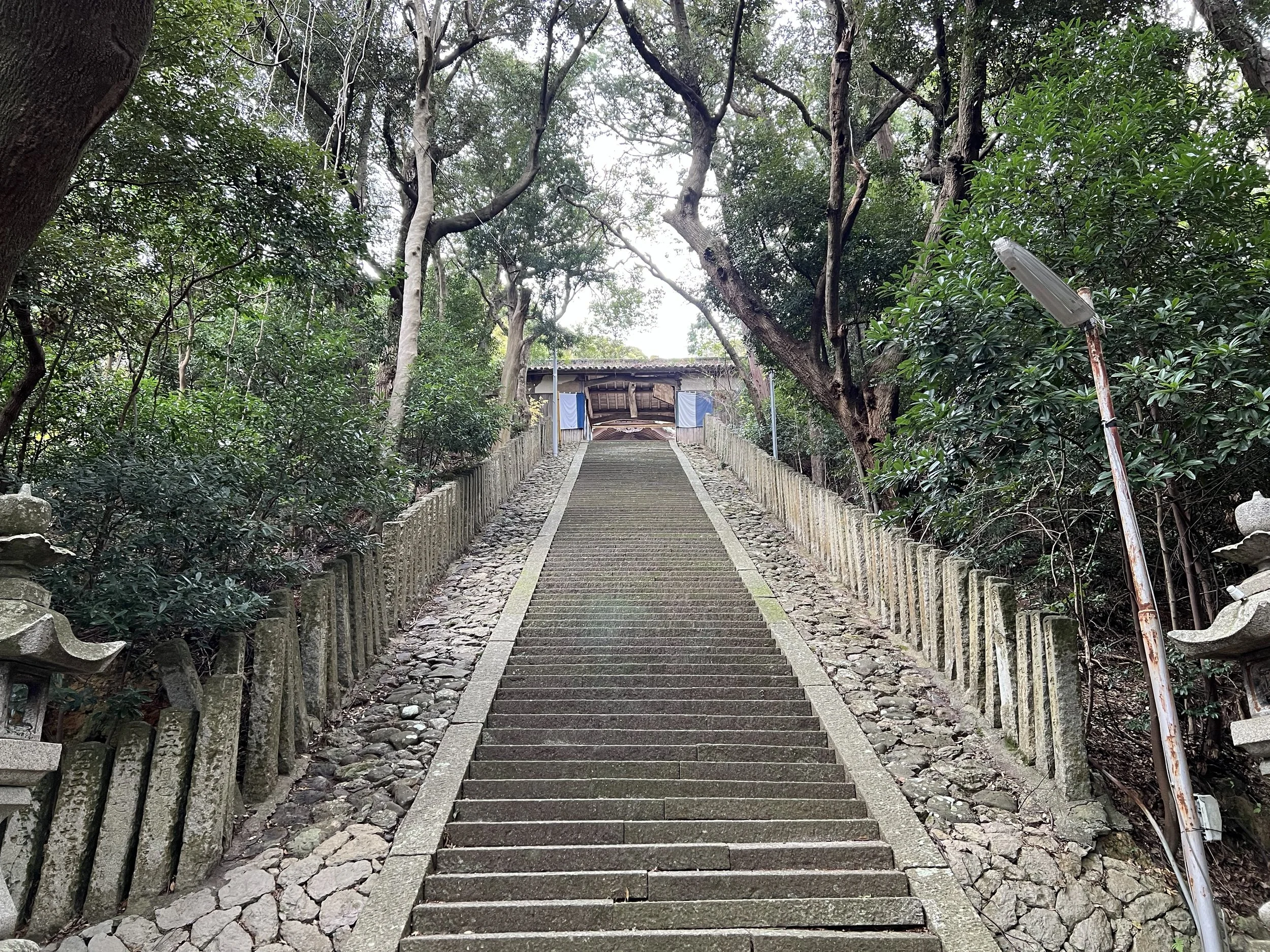 To reach the main shrine required climbing a steep flight of stone steps. Standing at the base and looking up, I briefly wondered if it might be enough just to admire the shrine from below. In the end, though, I climbed the stairs and reached the small but beautifully maintained shrine grounds at the top. Lanterns lined the approach, adding a quiet charm to the space. After spending a short time there, I made my way back down toward the fishing port.