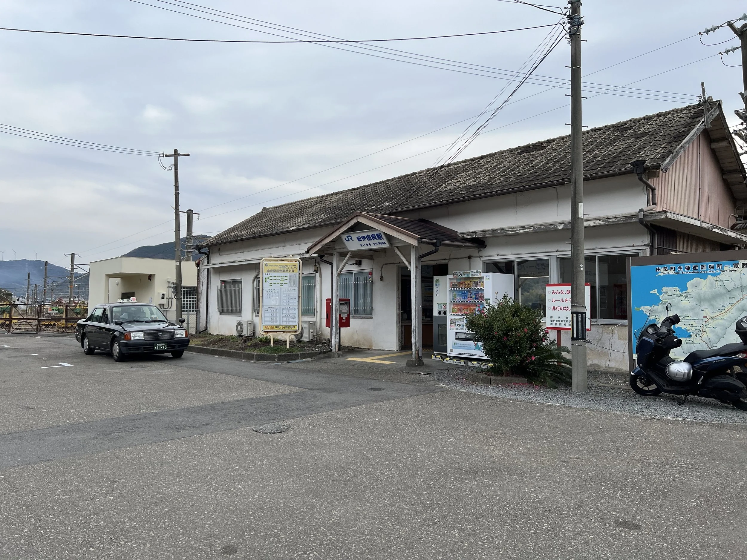 There were two places I wanted to visit along the Yura coastline in Wakayama: Totsui Limestone Cave and Shirasaki Marine Park. My original plan was to take the bus from Kii-Yura Station to get closer to the coast, but when I arrived, I noticed a sign posted near the bus stop explaining that buses wouldn’t resume service until January 4th due to the New Year holiday. Since it was January 3rd, that option was off the table.